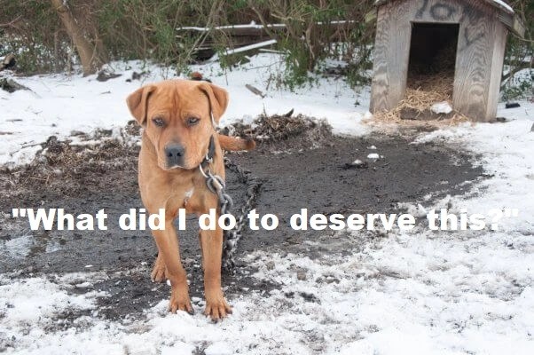 Many outdoor dogs are not fed properly, are not given clean water, and are not regularly examined. Even when food and water are provided, both can quickly become contaminated or knocked over, or out of reach.