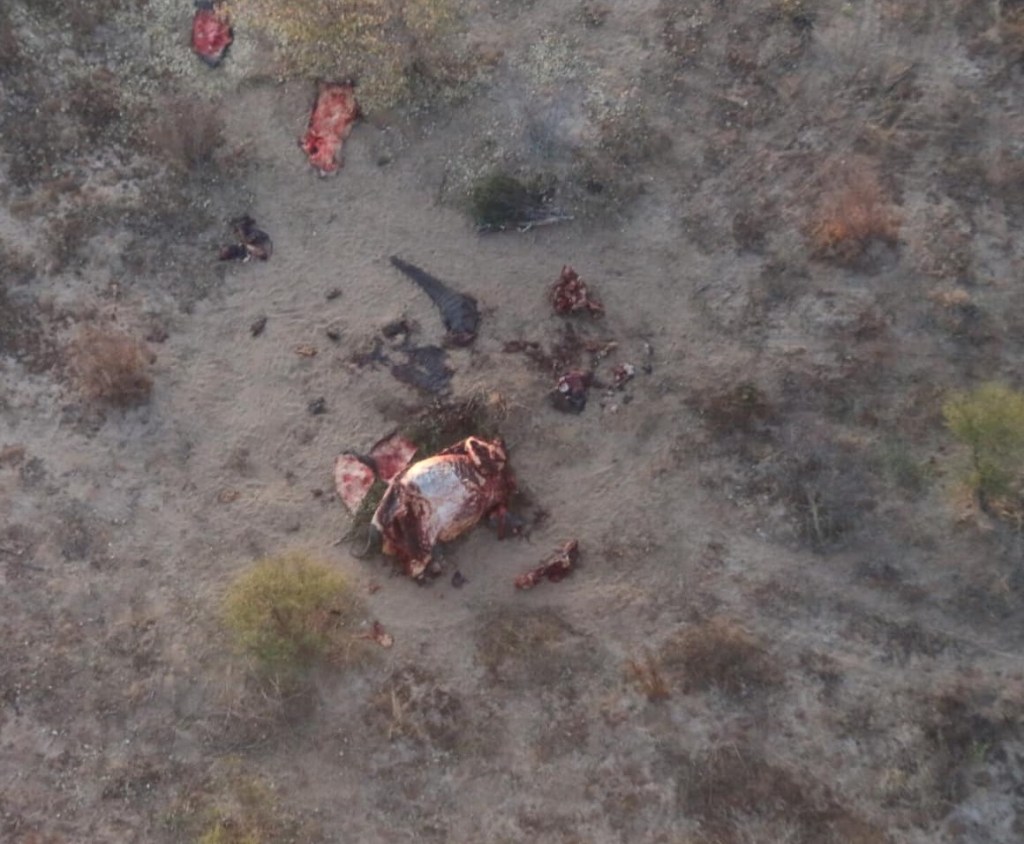 The adult Elephant Bull (above) has been stripped of its body-parts. The trunk has been hacked off. There are large portions of the Elephant’s skin cut off. All four feet have been removed – presumably to make foot / table stools (the Botswana president, Mokgweetsi Masisi, (in)famously gave Elephant foot stools to the presidents of neighbouring countries at an Elephant Management meeting in Kasane in 2019). The tusks and skull have been taken to a taxidermy. These body parts represent the prize – the trophy – that the hunter was after, and which will be displayed on a wall in their home in Europe or America or Asia. There is also some flesh cut off on the flanks of one side, possibly to provide some meat for the trackers and skinners as a ‘tip’.