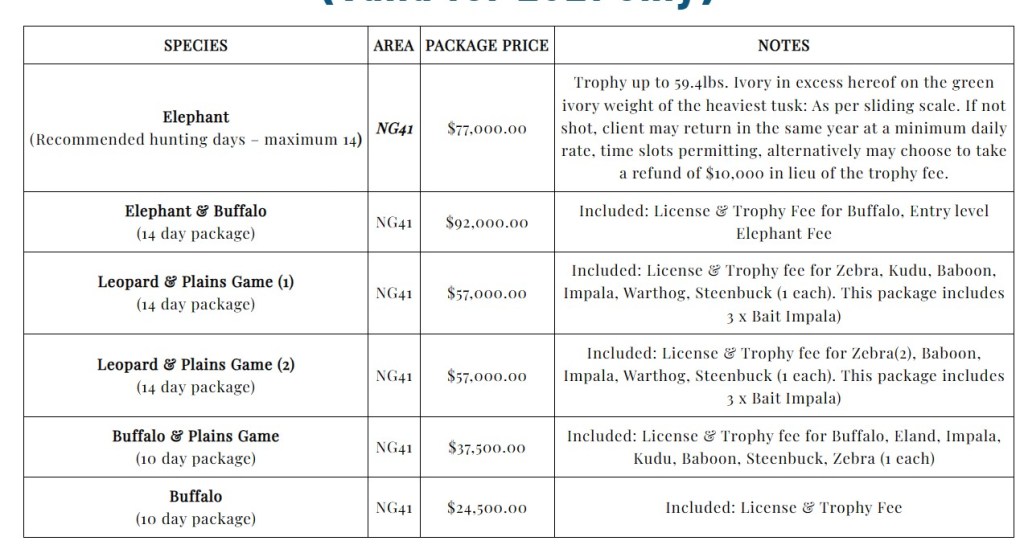 - Hunting quotas are not based on scientific data. A total quota of 356 Elephants and 74 Leopards are on the Wildlife Hunting Quota List for 2023. These figures are regarded as abnormally high. The list also includes Zebra, Buffalo, Ostrich, Wildebeest, Kudu, Eland, Gemsbok, Warthog, Baboon, and Lechwe.