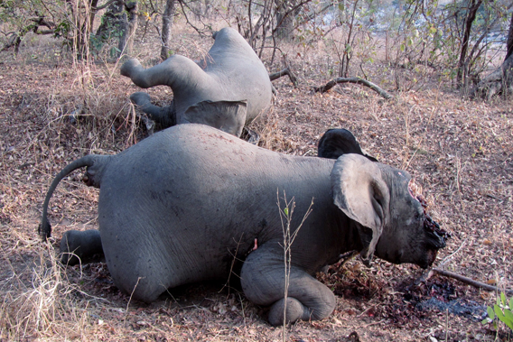 POACHED ELEPHANT ON ITS KNEES WITH ANOTHER LYING DEAD BEHIND IT