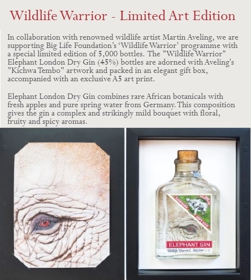 Elephant Gin, Wildlife Warrior – Limited Art Edition Set. In collaboration with renowned wildlife artist Martin Aveling, we are supporting Big Life Foundation’s ‘Wildlife Warrior’ programme with a special limited edition of 5,000 bottles. The “Wildlife Warrior” Elephant London Dry Gin (45%) bottles are adorned with Aveling’s “Kichwa Tembo” artwork and packed in an elegant gift box, accompanied with an exclusive A5 art print.