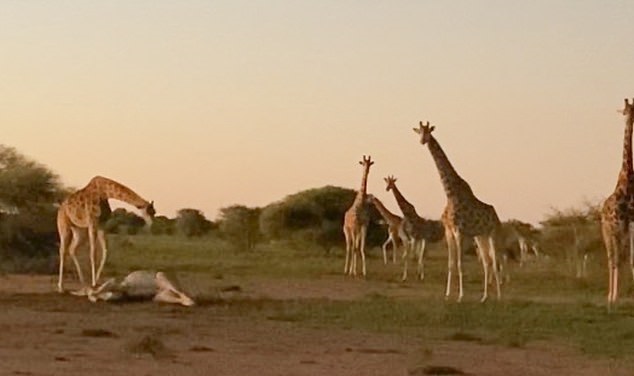 Photos show a group of more than five Giraffes examining the dead body as it lay on the ground.